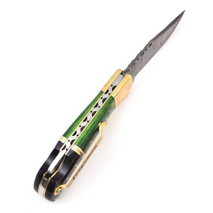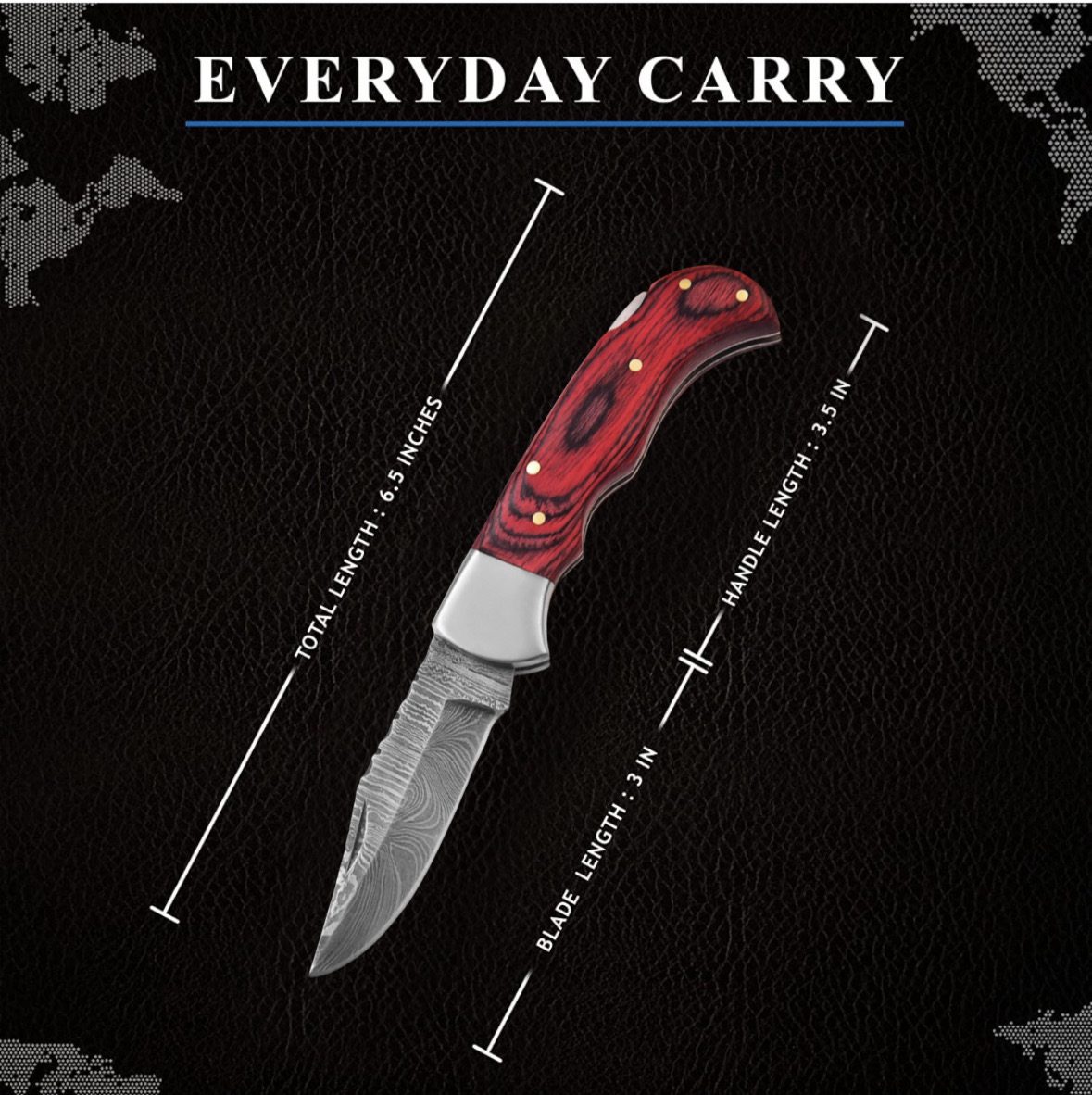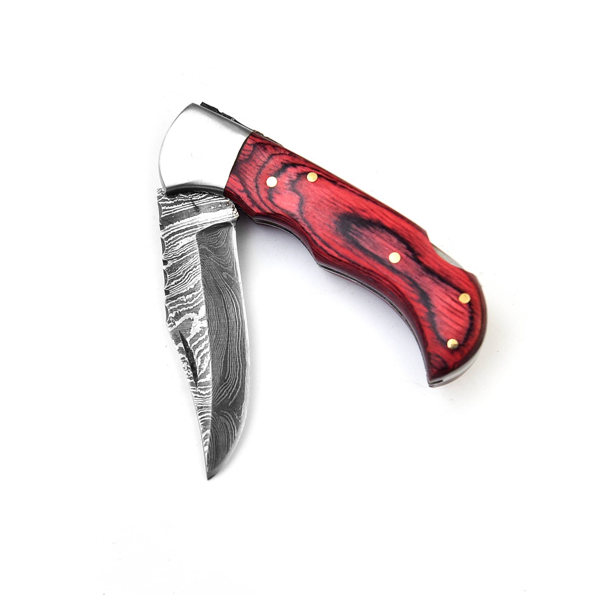 Knife Material: Damascus Steel, Steel Bolster, Red Pakka Wood